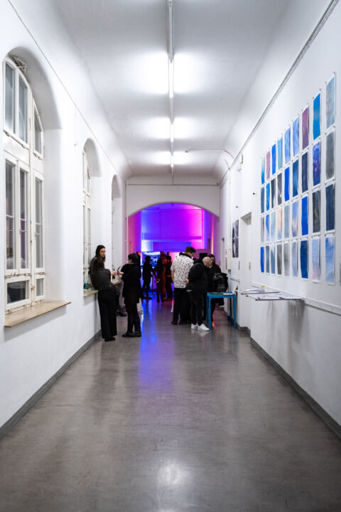The installation of linocut prints and accompanying research material displays a poetic approach towards the exploration of the infinite. Each print is unique and in its imperfection presents a singular depiction of the sky above. Lacking smooth contours or a horizon, viewers are presented with a personal glimpse into the ether, which they are forced to fill in themselves. Through observation, a personal positioning both within and towards that space is made possible.
