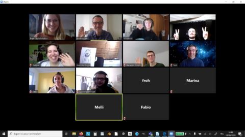 New Media-Studierende, Prof. Mario Doulis, Jörg Frohnmayer und Annekatrin Baumann, Projektleiterin Open Culture, im Online-Meeting