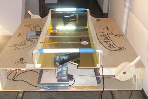 Fön, Staubsauger, Ventilator, Toaster, Radio, Küchenmixer, Bohrmaschine und andere mit 220V Netzstrom betriebene Haushaltsgeräte bieten viele Möglichkeiten für interaktive Kunstinstallationen. Vorausgesetzt man weiß, wie man sie umbaut, ansteuert und einsetzt. In diesem Workshop, angeboten vom Berliner Medienkünstler Niklas Roy, lernten die Studierenden, wie das Stromnetz funktioniert, wie man sicher und kreativ damit umgeht und wie man Elektrogeräte auf unterschiedliche Arten ansteuert (z.B. elektromechanisch oder per Computer). Hier zu sehen z.B. eine Variante des Videospiels “Pong”.
