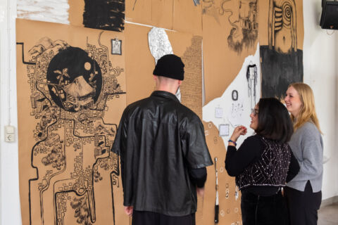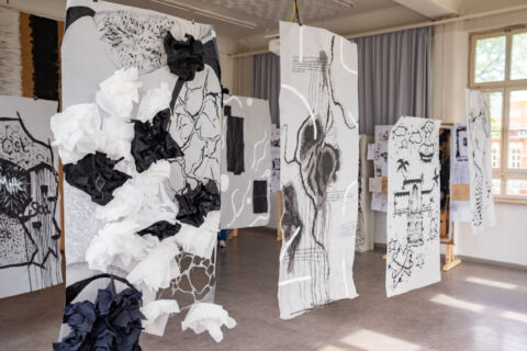 In diesem Kurs untersuchten die Studierenden mit Gastdozentin Christine Brey, wo die zweidimensionale Zeichnung aufhört und der dreidimensionale Raum beginnt: Durch die Fusion von Zeichnung und Installation überwinden wir die Grenzen der Zweidimensionalität und schaffen eine dynamische Interaktion zwischen Bild und Raum. Es geht darum, Möglichkeiten von Licht, Schatten, Objekt und Perspektive auszunutzen, um dem Bild Tiefe und ein anderes Narrativ zu geben. Dabei experimentieren wir mit verschiedenen Materialien, die den Übergang von der Zweidimensionalität zur Installation unterstützen, wie etwa vorhandene Objekte oder eigenen Skulpturen aus diversen Materialien.