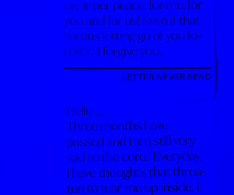 Die Rauminstallation wird auf zwei Ebenen dargestellt: Die autobiographische Arbeit über eine gescheiterte Liebesbeziehung wird mit Judith Butlers Theorie über soziale Verwundbarkeit sexueller Minderheiten in Bezug auf Bindungen in Beziehung gesetzt. Die theoretische Grundlage wird dabei durch persönliche Erlebnisse untermauert. Durch das räumliche Einsetzen einer Chromatischen Aberration gelingt es, diese zwei ineinander verflochtenen Ebenen räumlich sichtbar und erlebbar zu machen.
