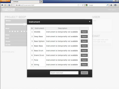 Internetnutzer mit verschiedenen demografischen Merkmalen haben Zugriff auf diese Anwendung. Die Teilnehmer können sich in einem “Channel” wiederfinden. Im “Channel” kann die Gruppe gemeinsam an einem Projekt mit algorithmischen Instrumenten musizieren und in einem Chat Informationen austauschen. Das Projekt beschreibt einen Prototyp mit dem Namen “HYPHON”, der nach den Prinzipien der Gestaltung ausgerichtet ist.