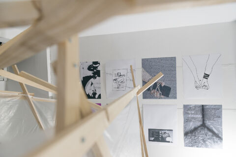 The space is dominated by a sculpture that was originally conceived as a kind of exhibition architecture to create planes and surfaces to project and hang works. It was intended to be “detached from its environment where different ideas could intersect in an attempt to create its own time-space dimension” (Domenik Gebhardt). The sculpture is completely present in the room but also hints at movement to outside of the space. It is both a surface of projection and a work in its own right. Helping thoughts and ideas to dematerialize at one point and rematerialize at another, it is a spacecraft and time-machine, a Tardis: Time And Relative Dimension In Space.