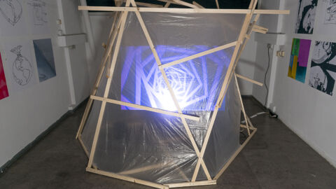 The space is dominated by a sculpture that was originally conceived as a kind of exhibition architecture to create planes and surfaces to project and hang works. It was intended to be “detached from its environment where different ideas could intersect in an attempt to create its own time-space dimension” (Domenik Gebhardt). The sculpture is completely present in the room but also hints at movement to outside of the space. It is both a surface of projection and a work in its own right. Helping thoughts and ideas to dematerialize at one point and rematerialize at another, it is a spacecraft and time-machine, a Tardis: Time And Relative Dimension In Space.