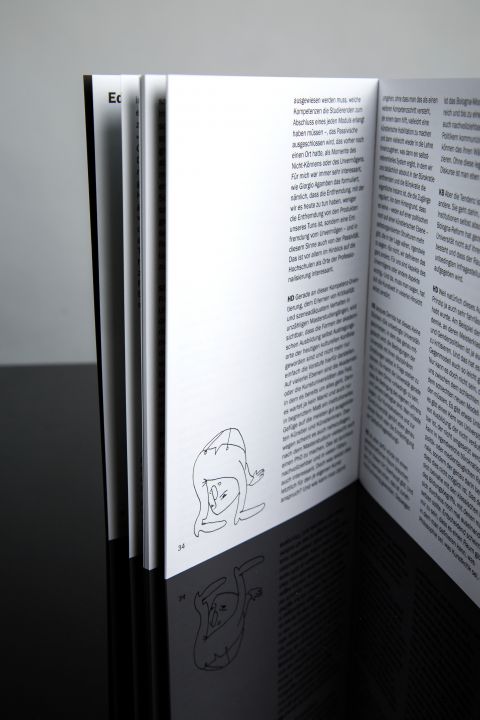 Für Akademien mit dem Anspruch der Einbindung von Theorie und Research in die (und als) künstlerisch-gestalterische Praxis hat sich das Lernziel der “richtigen” Reihenfolge von Denken, Planen und Ausführen längst überlebt. Und mit der Hochschulreform ist auch das Steinbergsche Motiv des Misslingens, Hinbiegens und Scheiterns im Grunde hinfällig geworden. Es ist einfach kompliziert(er) mit der nicht zuletzt vom Subjekt her kommenden “Produktion”. Nichtsdestotrotz wird im Grundton der hinlänglich bekannten Debatten zur Akademie weiterhin über mangelnden Raum für Wissensbildung geklagt. Andere monieren, die Praxis komme zu kurz. Es werden Schutzräume gefordert, in denen frei experimentiert werden kann. Schließlich wird angeführt, das “Denken” an Kunst- und Gestaltungsakademien sei tendenziell zu dünn, um Theorie zu sein, aber andererseits zu heilig, um aus dem Curriculum gestrichen zu werden.