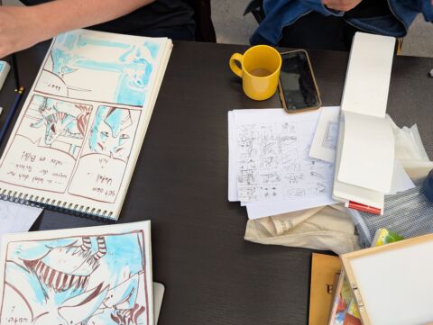 Die Comics im Enstehungsprozess ... The Drawing Club of the Merz Akademie invites you to the 24-hour comic session on March 28, 2026! In this special challenge, you will draw your personal comic for exactly 24 hours at the Merz Akademie. Together with other comic artists in a relaxed, collaborative atmosphere. Curated by illustration professor Florian Bayer.