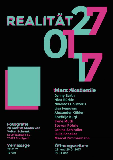 11 Studierende des Gestaltungskurses Fotografie I von Designer und Fotograf Volker Schrank zeigen in der Ausstellung “Realität” ihre fotografischen Positionen zum Thema. Die Vernissage findet am Freitag, 27. Januar um 19 Uhr im Studio von Volker Schrank statt. Ausstellungsdauer: 28. bis 29. Januar von 14 bis 18 Uhr.