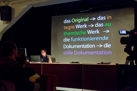 Während bei der Mehrzahl der Erhaltungsprojekte vor allem die Frage der Migration der Träger im Vordergrund stand mit dem ganzen Fragenkomplex der digitalen Langzeiterhaltung, war und ist dies bei AktiveArchive zwar ein wichtiges Standbein – jedoch haben wir früher als andere auch eine Systematik der historisch informierten Wiederaufführung dieser Werke entwickelt. Restaurierethische Prinzipien der Substanzerhaltung konkurrieren mit der berechtigten Forderung nach Funktionserhaltung der Werke.