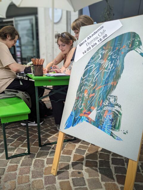 Those who visited the Merz Akademie’s Drawing Club at Wetterleuchten were able to draw comics with students and Prof. Florian Bayer. The scenic intervention by our femialog students was exciting – a project about sexualized violence, created as part of the cooperative semester project “Transformers” at the Merz Akademie under the direction of Prof. Joost Bottema, Prof. Anja Weber and Prof. Florian Bayer.