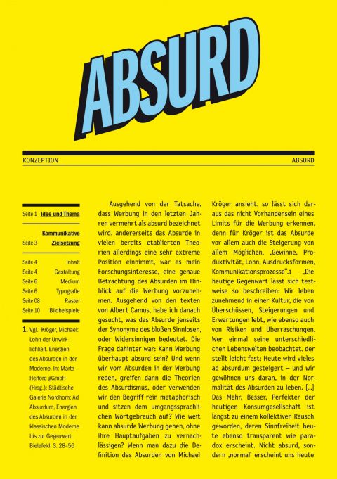 Das Absurde ist subjektiv, es ist temporär, es ist ein Ausgangspunkt. Die Arbeit „Absurd“ ist der Versuch, das Absurde jenseits des umgangssprachlichen Wortgebrauchs zu untersuchen und die Erkenntnisse daraus mit Beispielen aus der Werbung zu vergleichen. Sie soll vor allem Gestaltern zeigen wo das Absurde in der Werbung entstehen kann, um es zu erkennen und zu definieren und in dem alltäglichen Umfeld einordnen zu können. Aus der Arbeit zeigt sich, dass das Absurde nicht unmittelbar in der Werbung vorhanden ist. Es kann allerdings hervortreten, wenn die Subjektivität des Menschen mit bestimmten Merkmalen der Werbung zusammenstößt.