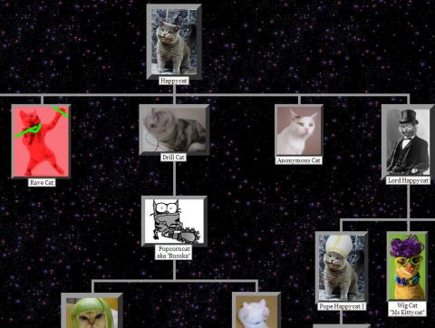 Kein anderes Tier scheint im Netz derart beliebt zu sein wie Katzen. Sogenannte „Lolcats“ (Lol = laut lachen) bilden seit ca. 2006 ein beliebtes und weit verbreitetes Internet-Phänomen, bei dem Katzenbilder mit (orthografisch fehlerhaften) Sprüchen versehen und über soziale Netzwerke geteilt werden. Doch woher kommen bloss all diese Katzen? Helene Dams betrieb Ahnenforschung und präsentiert in ihrer animierten Netzkunstarbeit „I Can Has History?“ den Familienstammbaum der „Lolcats“.