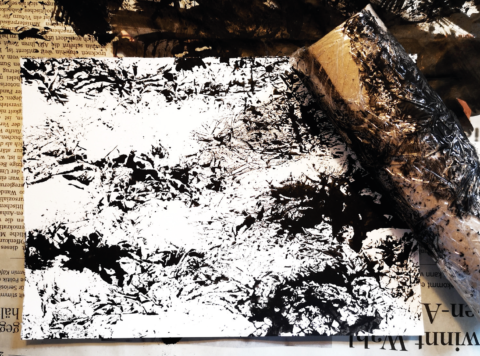 In diesem Fall wurden unübliche Zeichenwerkzeuge aus natürlichen Materialien, wie Zweige, Gräser oder Folie verwendet. Diese wurden in schwarze Tusche oder Farbe getaucht und auf der Fläche inszeniert. Die dabei entstehenden Strukturen sind sowohl abstrakt als auch konkret. Durch die Spuren, die sie auf dem Papier hinterlassen, bilden sich die natürlichen Materialen in gewisser Weise selbst ab.