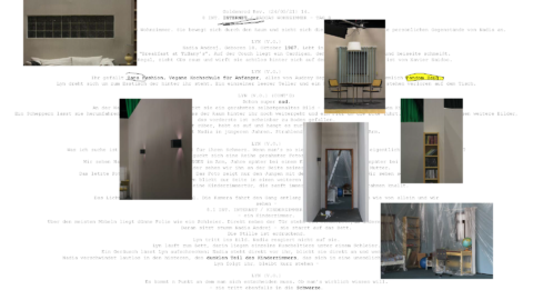 Eine Collage aus Filmsetfotografien, Textausschnitten aus einem Drehbuch und Hyperlinks. Die Arbeit beschäftigt sich kritisch mit der Filmindustrie, der medialen Inszenierung, „dem sozialen Foto“ und der damit einhergehenden Stilisierung von Inneneinrichtung.