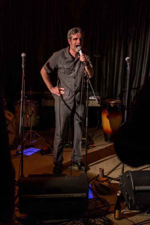 Das Performance-Kollektiv Schwabinggrad von Prof. Peter Ott tritt am 19. März 2017 im Stuttgarter Theater Rampe auf. Er spielt verschiedene Instrumente, tanzt und brüllt.