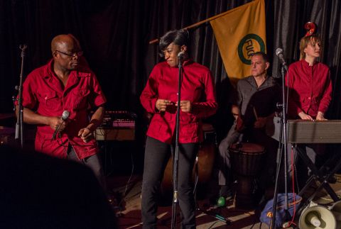Das Schwabinggrad Ballett, ein Polit- und Performancekollektiv, das sich zur Jahrtausendwende in Hamburg gegründet hat, hat im Frühjahr 2014 angefangen mit der Gruppe Arrivati zusammenzuarbeiten – ein Zusammenschluss von Refugees und People of Colour. Auf Demos und in Interventionen auf der Straße haben die beiden Kollektive eine Art experimentelle Tanzmusik entwickelt, gespielt auf Instrumenten, die man auf die Straße schleppen kann: Schrottige Schlagzeugteile, analoge Synthesizer, Melodica, Glockenspiel, Congas, Neunziger-Jahre-Sampler oder dem Böhmat, eine Sechziger-Jahre-Orgelmaschine von brechtschem Format.